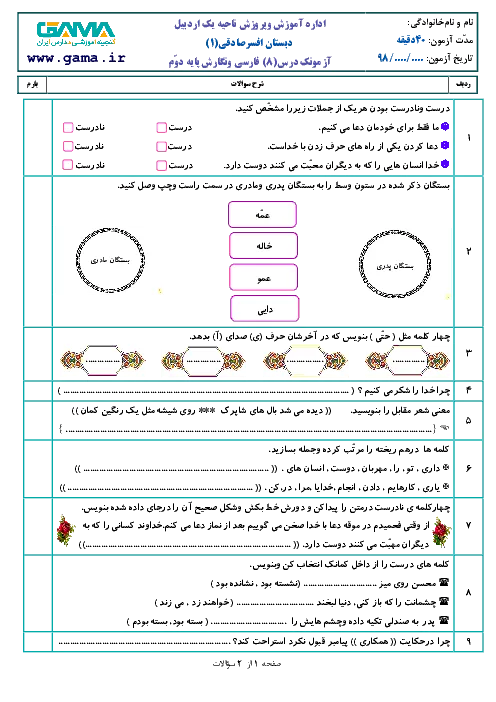 نمونه سوال امتحانی فارسی و نگارش درس 8 :از همه مهربان تر دوم ابتدائی همراه با پاسخنامه تشریحی