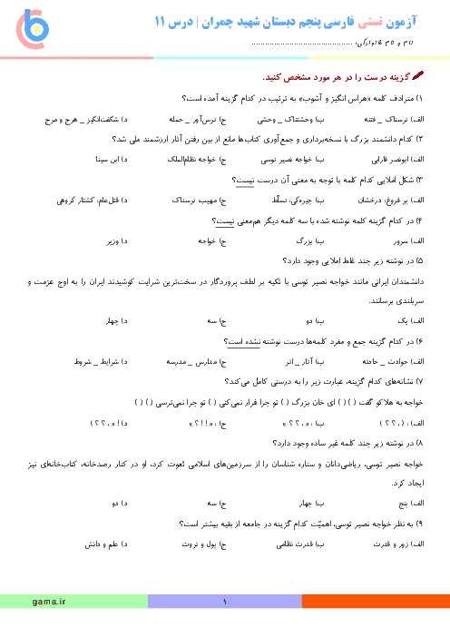 آزمون تستی فارسی پنجم دبستان شهید چمران تنکابن | درس 11: نقشِ خردمندان