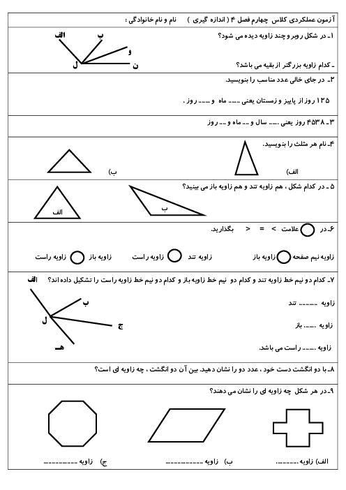 آزمون عملکردی کاربرگ مهارت محور ریاضی فصل 4: اندازه گیری پایهی چهارم ابتدائی همراه با پاسخنامه کلیدی