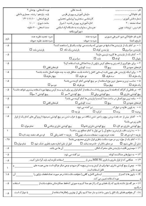 سوالات امتحان پودمانی تزیینات چوبی و پارچهای یازدهم هنرستان سما | پودمان 3: جدا کنندۀ چوبی