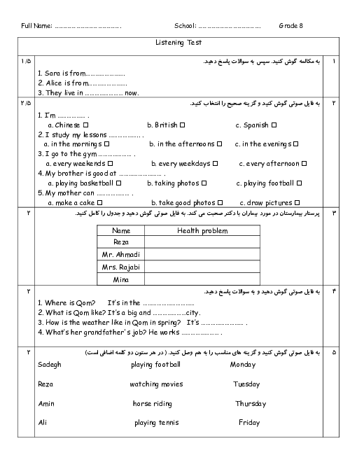 نمونه سوال امتحانی خرداد 1398 شنیداری نوبت دوم انگلیسی پایه هشتم همراه با پاسخنامه تشریحی