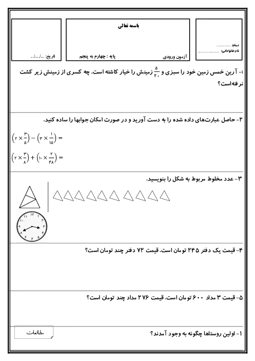 آزمون ارزشیابی ورودی دروس پایه چهارم به پنجم دبستان همراه با پاسخنامه تشریحی
