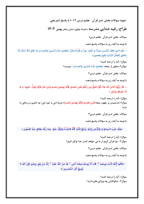 نمونه سوالات تدبر در قران درس به درس پایه هفتم ترجمه ایات و مفهومی وبا پاسخنامه تشریحی بهمن1402