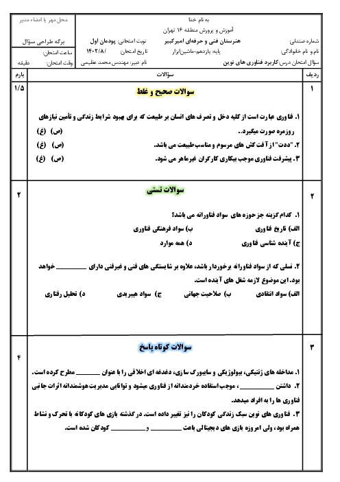 امتحان کاربرد فناوری های نوین هنرستان فنی فجر | پودمان 1: سواد فناورانه
