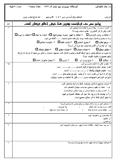 آزمون مستمر آذر 96 پیامهای آسمان درس 4 تا 6 پایه نهم