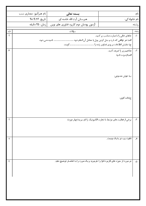 نمونه سوال امتحانی پودمانی کاربرد فناوریهای نوین پودمان 2: فناوری اطلاعات و ارتباطات پایه یازدهم