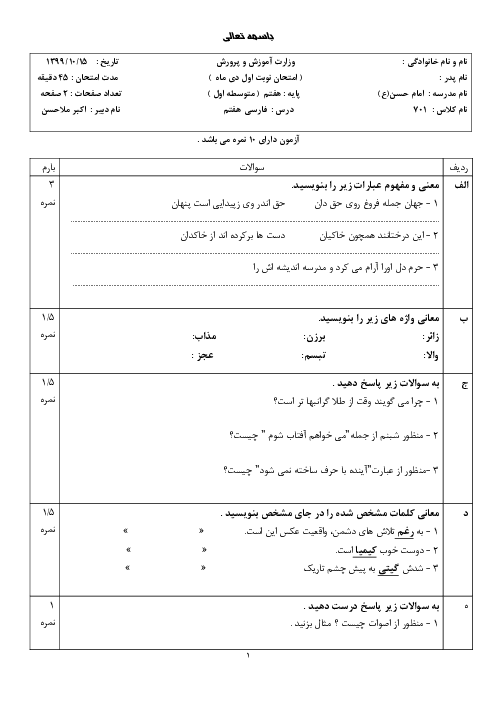آزمون نیمسال اول فارسی هفتم مدرسه امام حسن (ع) | دی 1399
