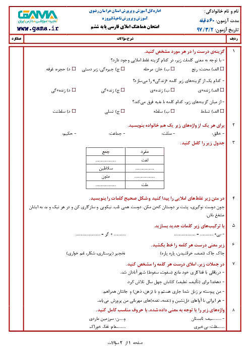 سؤالات امتحان هماهنگ نوبت دوم املای فارسی پایه ششم ابتدائی مدارس ناحیۀ فیروزه | خرداد 1397
