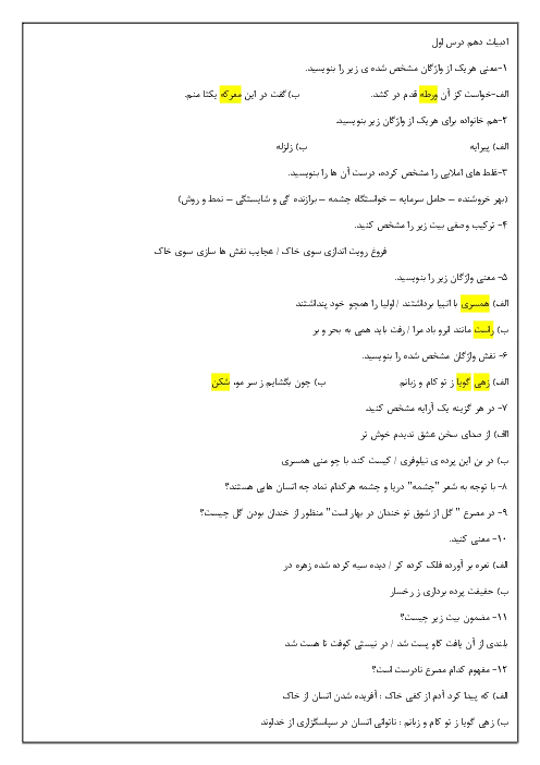 آزمون فارسی (1) درس 1 و 2 پایه دهم دبیرستان همراه با پاسخنامه تشریحی