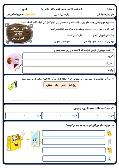 نمونه سوالات امتحانی فارسی دوم دبستان ادب درس 1: کتابخانهی کلاس ما همراه با پاسخنامه تشریحی