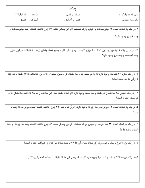 کاربرگ حدس و آزمایش ریاضی دوم دبستان