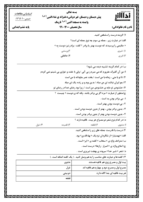 آزمون مداد کاغذی فارسی ششم دبستان نداء النبی | درس 10 تا 12