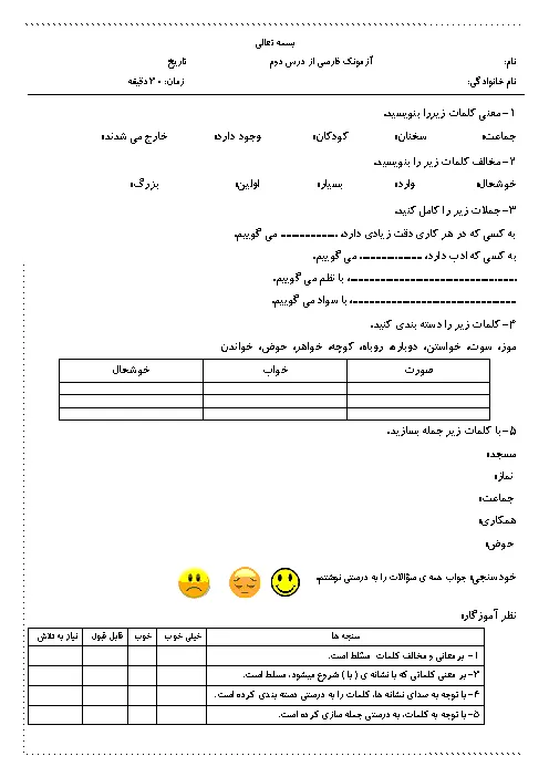 آزمونک کاربرگ فارسی درس 2 :مسجد محلّهی ما پایه دوم دبستان
