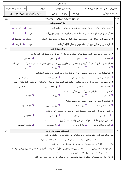 سوالات امتحان توسعه سلامت و سبک زندگی با ورزش دوازدهم هنرستان | پودمان 1: برنامه ریزی بازیها و ورزشهای سنتی