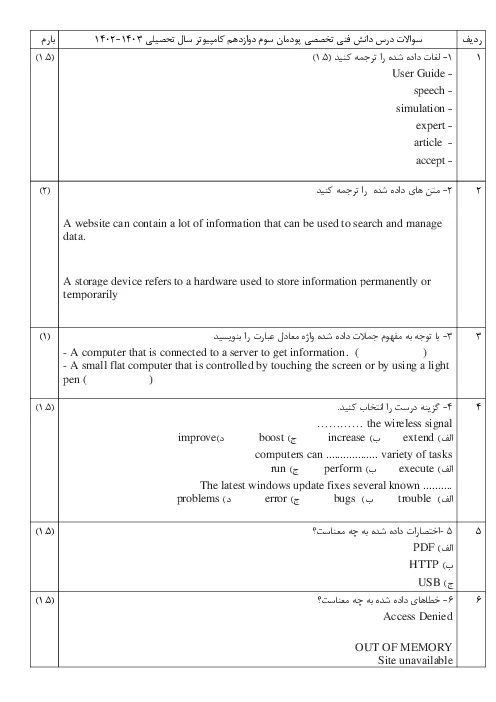 نمونه سوال امتحانی درس دانش فنی تخصصی رشته شبکه و نرم افزار رایانه پودمان 3: کسب اطلاعات فنی