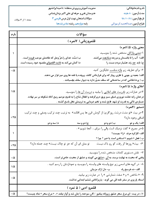 نمونه سوالات امتحانی نیمسال اول فارسی و نگارش (3) دوازدهم هنرستان دی 1398 همراه با پاسخنامه تشریحی