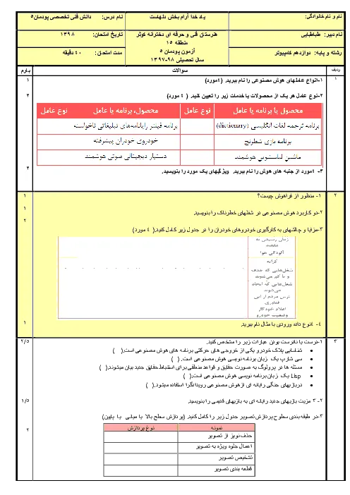 آزمون پودمانی دانش فنی تخصصی دوازدهم رشته شبکه و نرم افزار رایانه | پودمان 5: کاربرد هوش مصنوعی