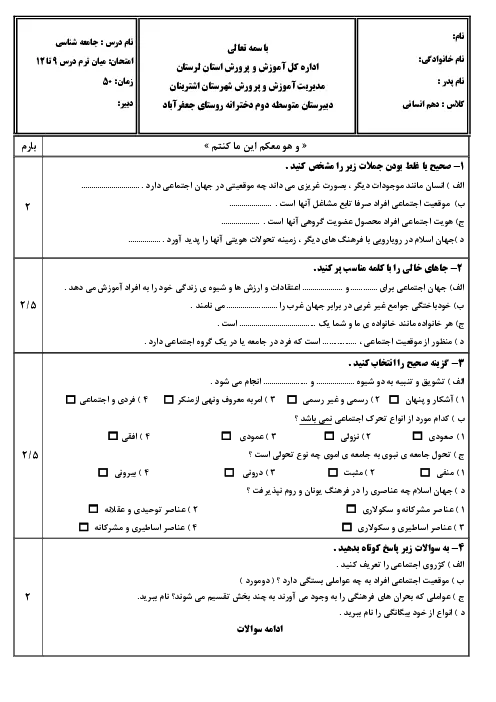 امتحان درس 9 تا 12 جامعه شناسی (1) دهم دبیرستان شهدای جعفر آباد