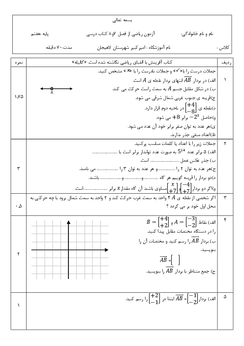 سوالات امتحان ریاضی هفتم دبیرستان امیرکبیر لاهیجان | فصل 7 و 8