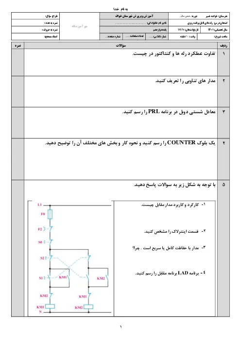 آزمون طراحی و اجرای رلههای قابل برنامه ریزی دوازدهم هنرستان فنی خواجه نصیرالدین طوسی | پودمان 3: رلههای قابل برنامه ریزی در تأسیسات صنعتی