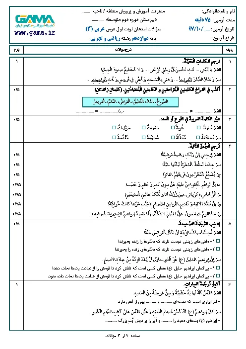 نمونه سوال امتحان نوبت اول عربی (3) دوازدهم رشته ریاضی و تجربی | سری 4 + پاسخ