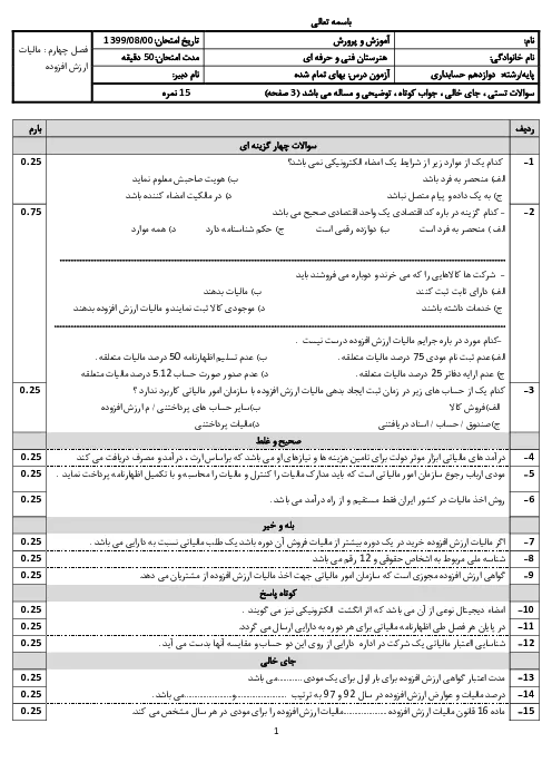 نمونه سوال امتحانی تستی و تشریحی درس حسابداری بهای تمام شده و مالیاتی پودمان 4: مالیات بر ارزش افزوده پایه دوازدهم |