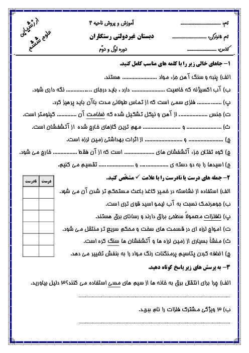 ارزشیابی علوم تجربی ششم دبستان غیردولتی رستگاران | درس 1 تا 5