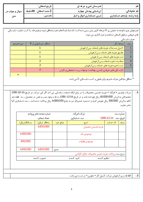 سوالات امتحان پودمان 4 حسابداری اموال و انبار یازدهم هنرستان | ثبت هزینههای خدمات پس از فروش