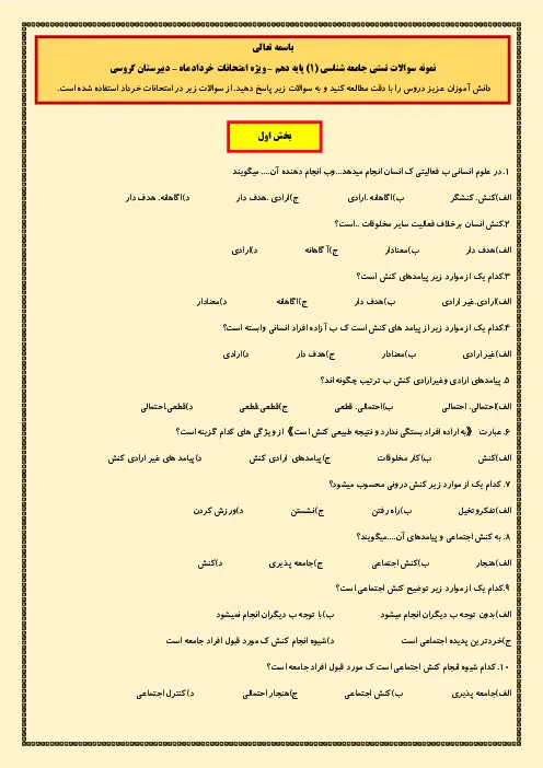 آزمون های مجموعه ای تستی درس جامعه شناسی بخش 1 تا 4 پایه دهم