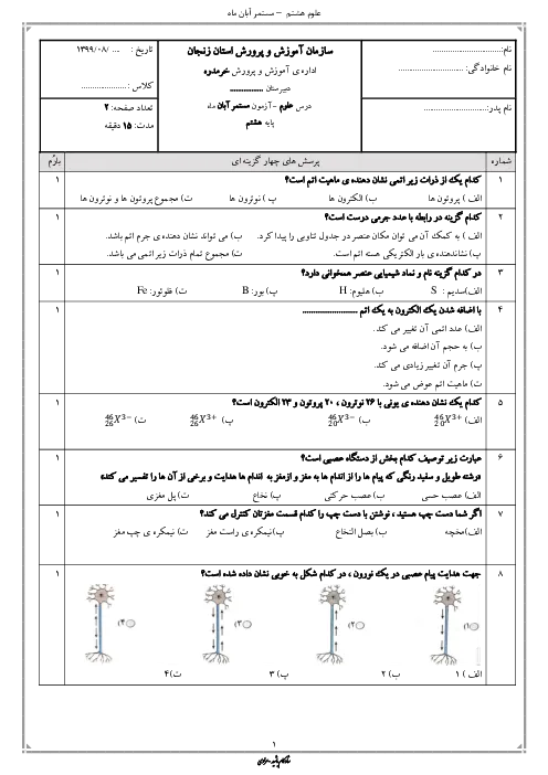 سوالات آزمون تستی فصل 3 و 4 علوم تجربی هشتم مدرسه شهید مطهری خرمدره