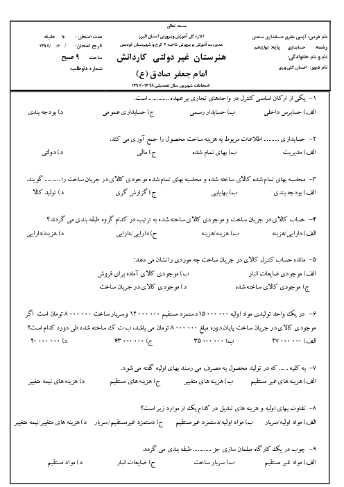 آزمون نوبت دوم حسابدار صنعتی درجه 2 دوازدهم هنرستان کاردانش امام جعفر صادق (ع) | شهریور 1398