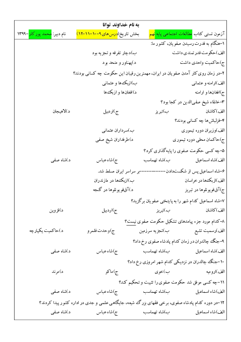نمونه سوال امتحانی تستی مطالعات اجتماعی (بخش تاریخ: درس 9 تا 12) پایه نهم همراه با پاسخنامه کلیدی