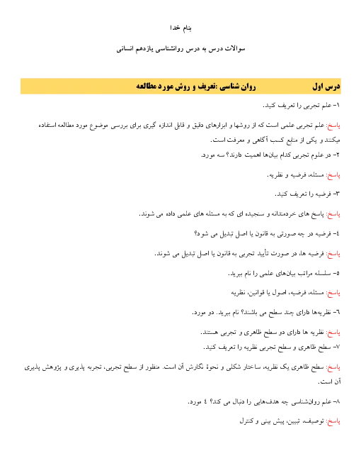 سوالات درس به درس روانشناسی یازدهم انسانی | درس 1 تا 8
