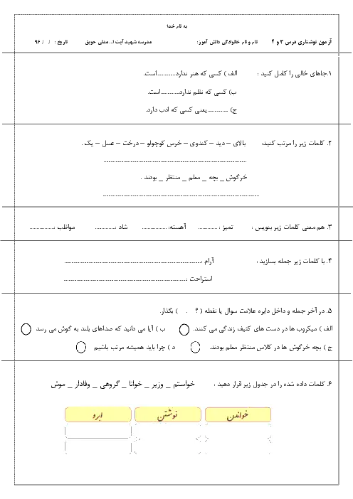 آزمون نگارش فارسی کلاس دوم دبستان شهید آیت اله مدنی حویق | درس 3 و 4