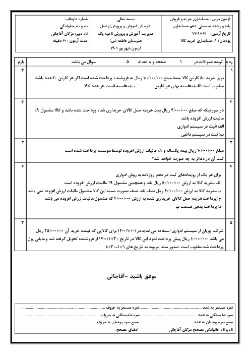 نمونه سوال امتحانی پودمانی حسابداری خرید و فروش پودمان 1: حسابداری خرید کالا پایه دهم