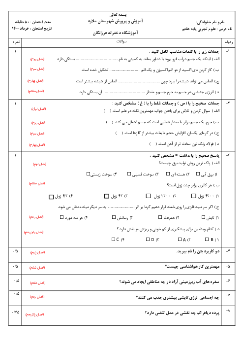 سوالات امتحان ترم دوم علوم تجربی هفتم مدرسه فرزانگان | خرداد 1400