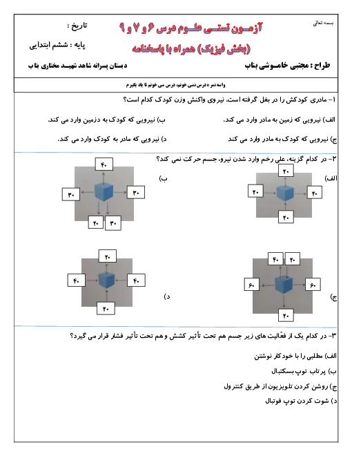 سوالات تستی علوم تجربی ششم دبستان شهید مختاری | درس 6 تا 9