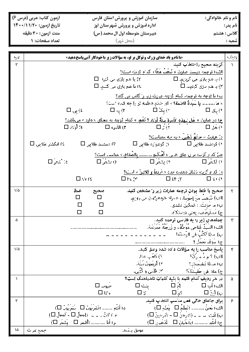آزمون عربی هشتم مدرسه آل محمد (ص) | درس 6: فِي السَّفَرِ