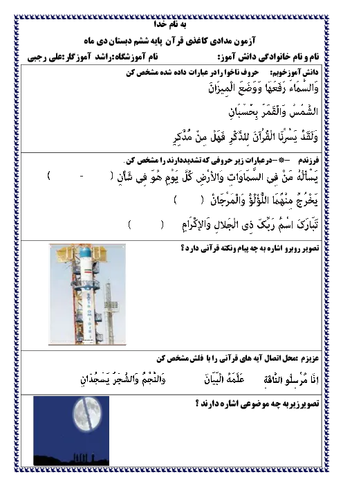 آزمون مداد کاغذی قرآن ششم دبستان راشد | درس 5 تا درس 8