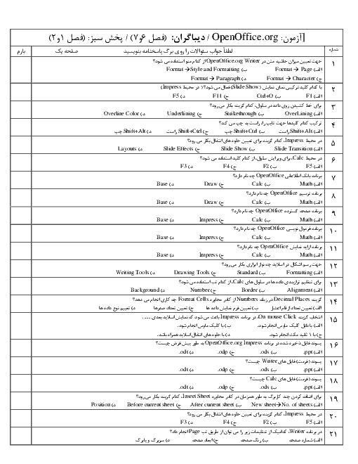نمونه سوال امتحانی تستی رایانه کار مقدماتی نرم افزار OpenOffice.org پایه دهم همراه با پاسخنامه کلیدی