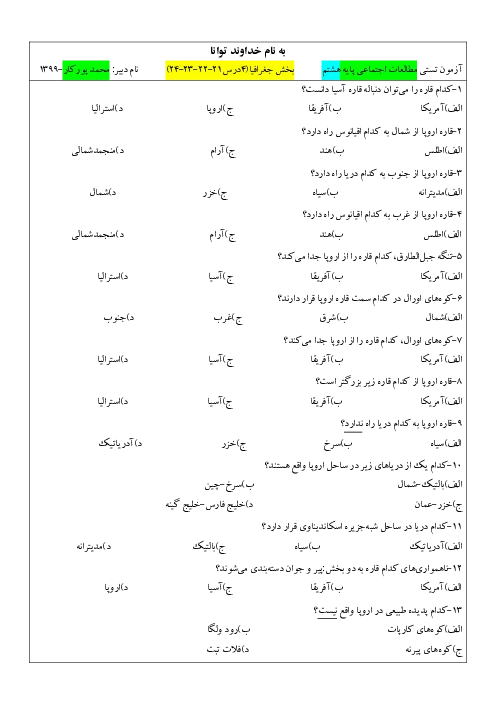نمونه سوال امتحانی تستی مطالعات اجتماعی درس 21 تا 24 پایه هشتم همراه با پاسخنامه کلیدی