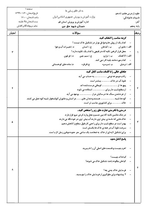ارزشیابی مستمر علوم تجربی پنجم دبستان شهید حق بین | درس 8 تا 10