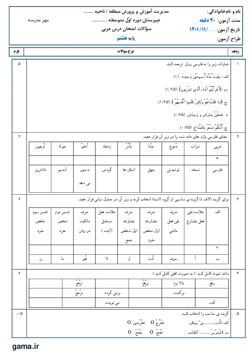 آزمون درس 5 و 6 عربی هشتم دبیرستان شهید بهشتی آمل