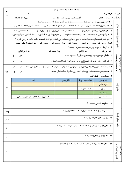 نمونه سوالات امتحانی مداد کاغذی علوم تجربی چهارم دبستان درس 8 تا 11 همراه با پاسخنامه تشریحی