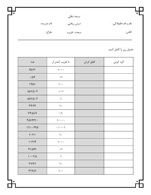 کاربرگ تقریب با روش قطع کردن و گرد کردن