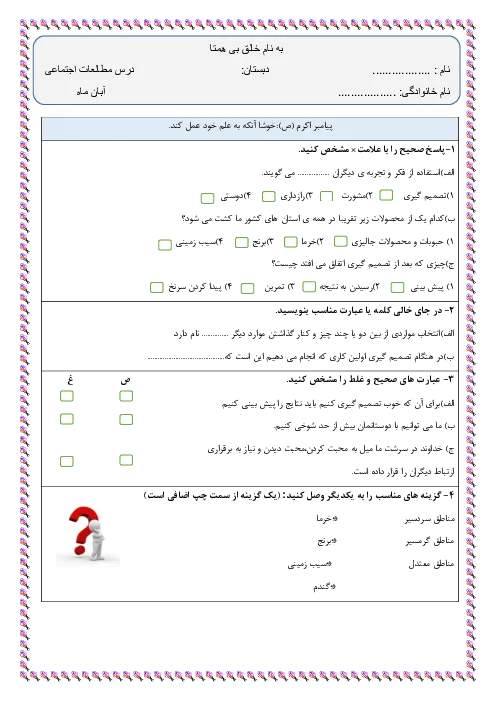 آزمون میان ترم کتاب مطالعات اجتماعی درس 1 تا 6 پایه ششم دبستان همراه با پاسخنامه تشریحی