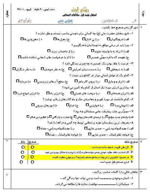 آزمون نوبت اول مطالعات اجتماعی ششم دبستان شهید مطهری | درس 1 تا 12