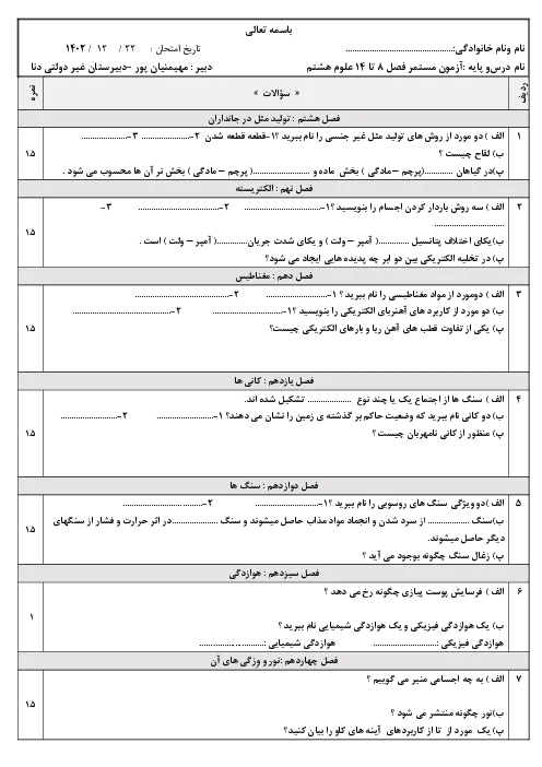 نمونه سوال امتحانی مستمر علوم فصل 8 تا 14 پایه هشتم دبیرستان همراه با پاسخنامه تشریحی