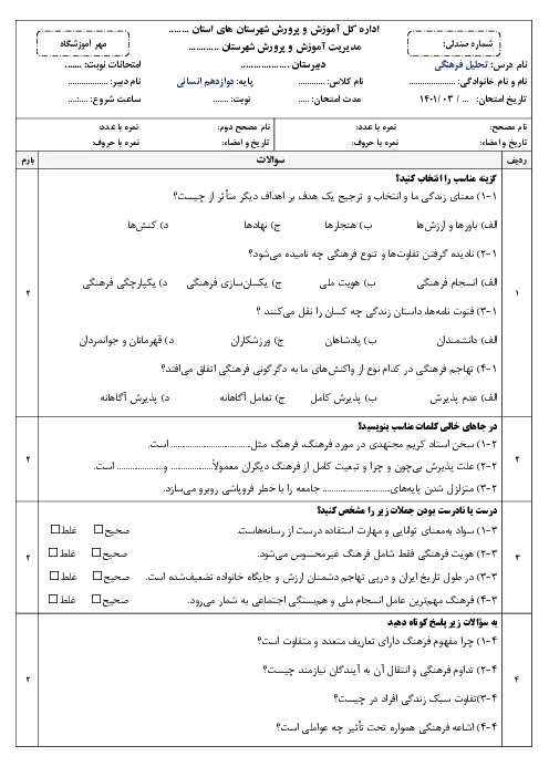 سوالات امتحان آزمایشی نوبت دوم مطالعات فرهنگی دوازدهم | خرداد 1401