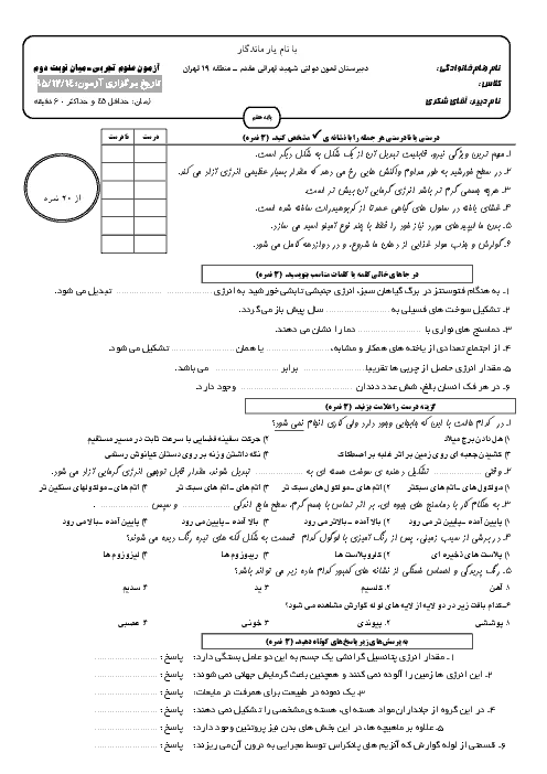 آزمون میان نوبت دوم علوم تجربی پایه هفتم مدرسه نمونه دولتی عبدالحسین زمانی | فصل 8 تا 13